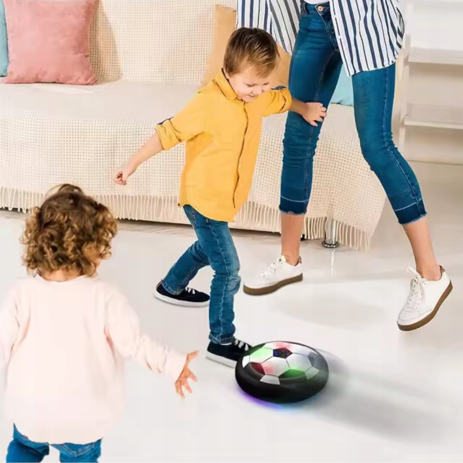 LightKick™ nie potrzebujesz dużego boiska ani specjalnych warunków — wystarczy kawałek podłogi! Piłka działa świetnie na panelach, płytkach czy parkiecie, więc możesz grać w salonie, korytarzu czy pokoju dziecięcym. Dzięki lekkiej konstrukcji i cichej pracy wentylatora zabawa nie przeszkadza domownikom. To domowy futbol, który możesz rozpocząć w każdej chwili!
